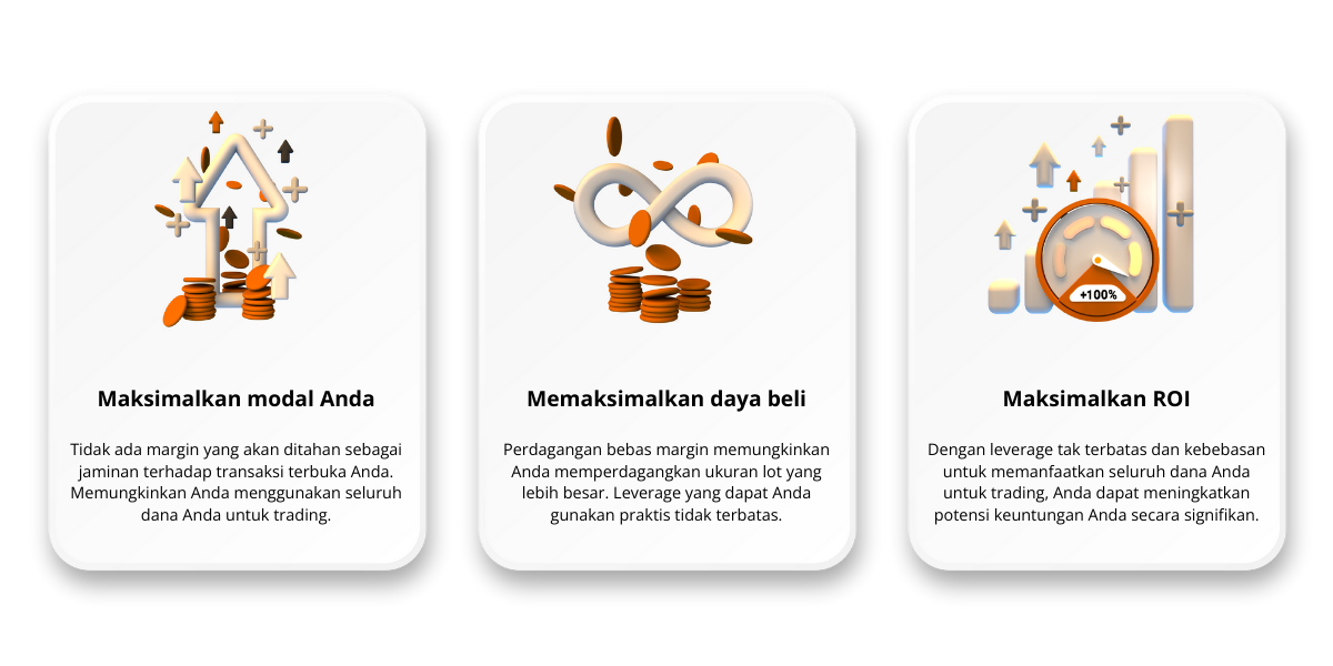 • Maksimalkan daya beli: Trading tanpa margin memungkinkan Anda untuk trading dengan ukuran lot yang lebih besar.